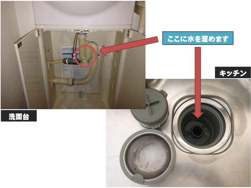 空き家ガーディアンズでは排水トラップに水を溜めることを封水と呼んでいます。